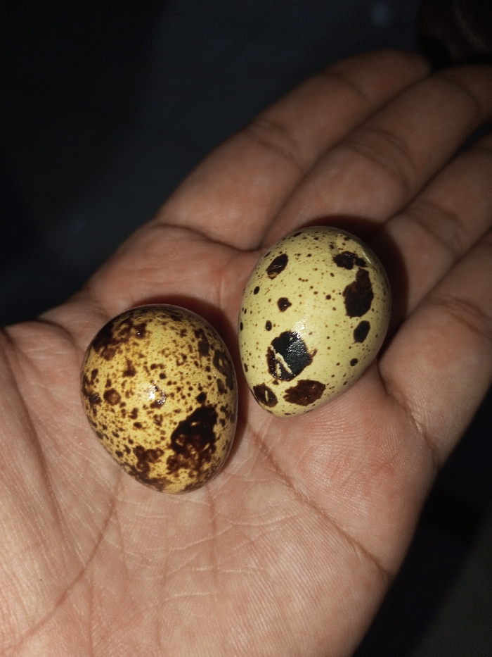 - "A single human hand, exhibiting a medium-tan skin tone, is centrally positioned, palm open and facing upwards, holding two small, oval-shaped eggs" by FM-OUF5o1, licensed under CC BY 4.0