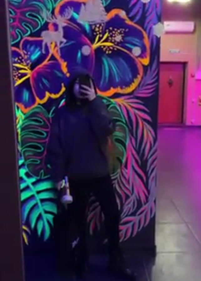 A woman is taking a selfie in front of a brightly painted wall. The wall has a black background with neon-colored tropical flowers and leaves. The woman is wearing a dark gray hoodie, black pants, and black boots. She has headphones on and is holding her phone up to take the picture. The lighting is mostly purple and blue, and the environment appears to be a public space like a hallway, with a red door and other decorations visible in the background.