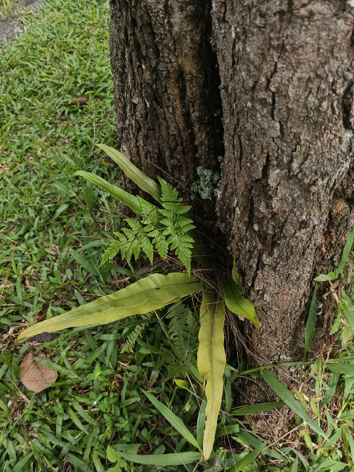 A close-up shows the base of a tree with ferns and various grasses growing around it. Two large trunks are pressed closely together. One fern is especially green and feathery, contrasting with the longer, yellower fronds of another type of fern. The grass is a mix of green blades. The bark of the tree is rough and textured. Small pieces of green moss or lichen can be seen growing on the tree.