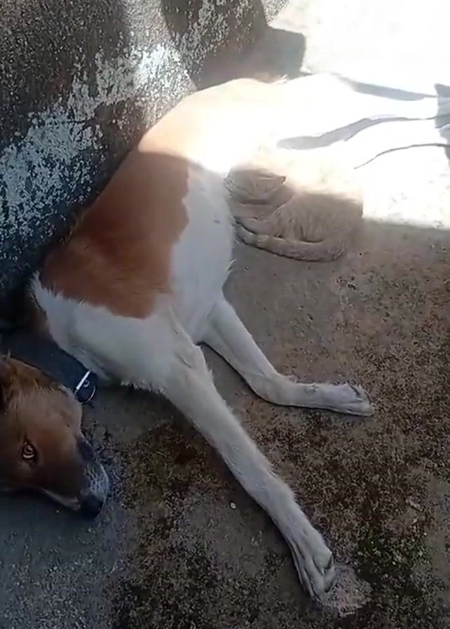 A dog is lying down on a concrete surface next to a wall. The dog is mostly white with some brown patches. It has a black collar around its neck. The dog is lying on its side, with its legs outstretched. The surface it is lying on has a somewhat mottled appearance. The sun casts shadows on the dog and the surface around it.