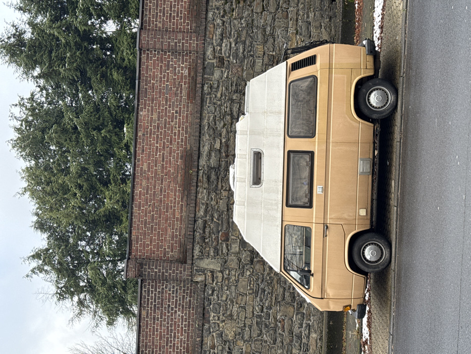 This image depicts a static scene on a street in Remscheid, Germany, under an overcast sky. A light brown (tan) Volkswagen Type 2 (T3) Transporter camper van, equipped with a white, elevated camper roof featuring a small rectangular vent, is parked facing right on the side of a damp asphalt road. The vehicle's left side is visible, displaying a side door, multiple rectangular windows, and silver hubcaps on its wheels. A black ladder is affixed to the rear of the van, above a vertical louvered vent. Traces of white material, consistent with light snow or frost, are visible on the ground directly next to the curb and on the branches of the trees. Behind the van, a retaining wall rises. The lower section of this wall is constructed from irregular grey-brown natural stone blocks. Above this, a red-brown brick wall, laid in a stretcher bond pattern with dark mortar, extends horizontally, capped by a dark coping. Above the brick wall, a dense line of tall, dark green coniferous trees is visible, also bearing sparse white patches of snow. Bare tree branches are partially visible on the far left against the grey sky. No individuals or active interactions are present in the scene.