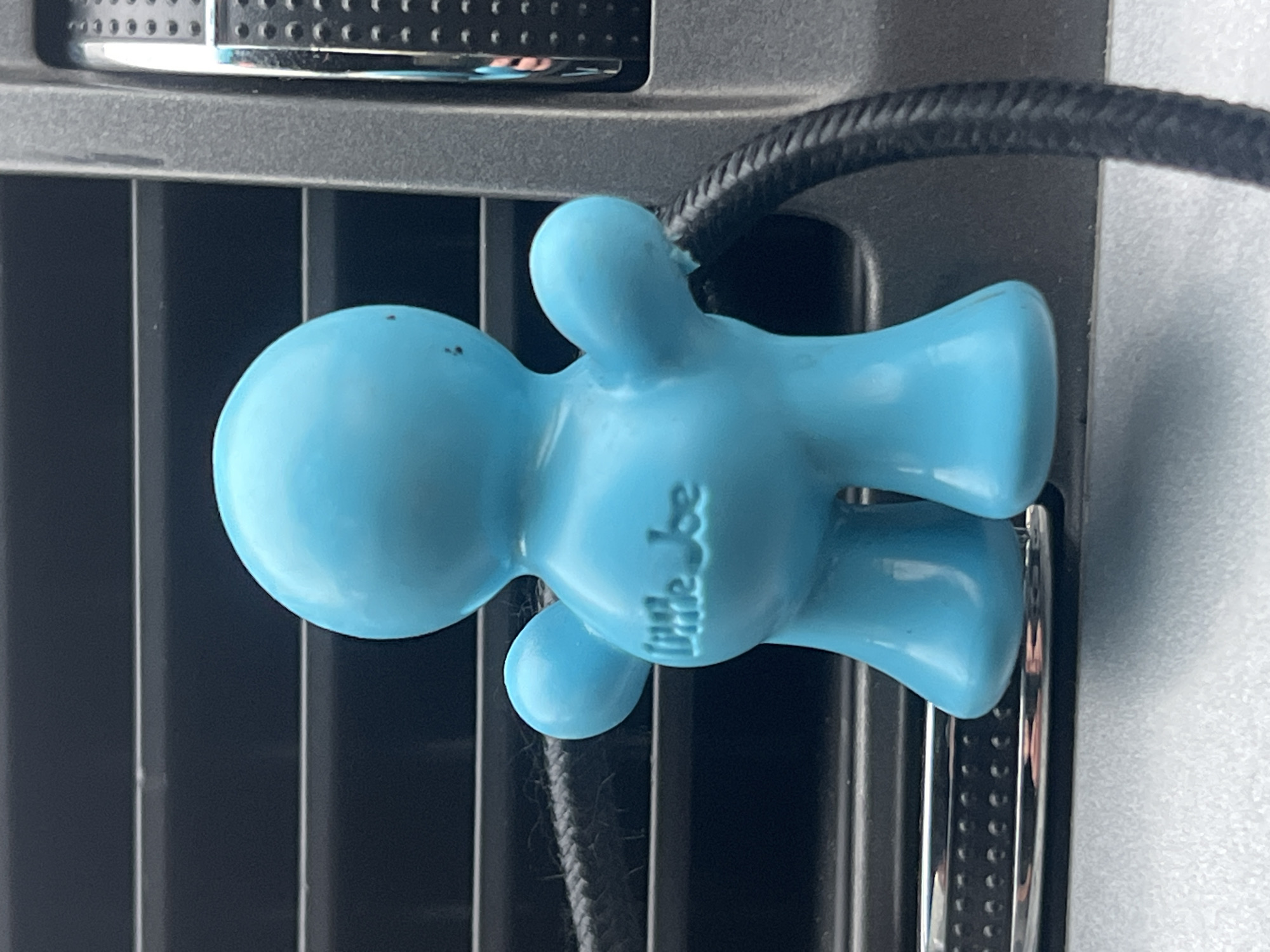 A light blue, anthropomorphic "Little Joe" branded plastic figure, approximately 6 cm in height, is centrally positioned and mounted within the interior of a vehicle in Sliven, Bulgaria. The figure, exhibiting a rounded head, stubby arms, and two leg-like supports, has the text "Little Joe" embossed on its dorsal aspect. It is attached to a dark gray horizontal slat-style air vent, which is integrated into the vehicle's dashboard. To the right of the figure, a section of a dark gray textured plastic panel with a vertical chrome-colored trim piece, featuring small circular indentations, is visible. A braided black cable runs horizontally behind the figure, passing to the right. A lighter gray, subtly textured dashboard surface is present below the air vent. The scene is well-lit.