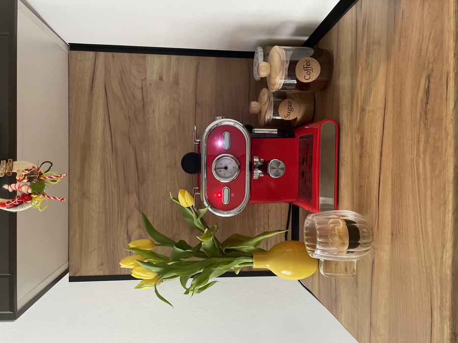 The scene depicts an indoor environment in the city of Varna, Bulgaria, specifically a well-organized coffee station setup on a wooden countertop. In the mid-ground, a glossy red retro-style espresso machine with chrome accents is prominently positioned. The machine displays two illuminated red indicator lights, suggesting it is powered on or in standby mode. A circular pressure gauge is centered on its front panel, and a black, spherical knob is situated on its top surface. To the left of the espresso machine, a bright yellow ceramic vase holds a bouquet of approximately seven yellow tulips with green stems and leaves. In the immediate foreground, positioned to the left of the espresso machine, a clear, fluted glass mug with a handle contains a dark espresso beverage topped with a light brown crema. To the right of the espresso machine, two clear glass jars with light wooden lids are visible. The left jar, labeled "Sugar," contains light brown granulated sugar. The right jar, labeled "Coffee," contains dark ground coffee. A third, partially obscured clear jar is located behind the "Coffee" jar. The objects rest on a light to medium brown wooden countertop with a distinct grain pattern. A matching wooden panel serves as the back wall, framed by dark vertical edges. White wall sections are visible to the far left and right, suggesting an alcove or cabinet interior. Above the wooden back panel, a dark grey or black shelf underside is visible. Hanging from this upper shelf, directly above the espresso machine, is a decorative item resembling a traditional Bulgarian Martenitsa, featuring intertwined red and white elements, small figures, green accents, and a wooden tag partially inscribed with "ЧЕСТИТА БАБА МАРТА!" (Happy Baba Marta!).