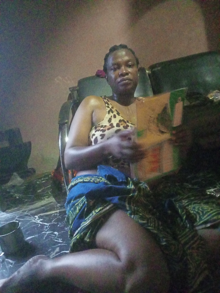 An adult female is seated on the floor in an indoor setting, location Unknown, Unknown. She has dark skin, braided hair, and is wearing a leopard-print tank top and a blue and green patterned wrap skirt. Her skin appears glossy. She holds an open book or magazine with a light cover and green accents in her hands, which are blurred from motion. She looks directly at the camera with a neutral expression. Behind her is a dark chair or piece of furniture. To her left, on the dark, marbled-patterned floor, a metallic cup is visible. A dark green patterned fabric lies on the floor to her right. The wall in the background is a light brown, and the scene is dimly lit.