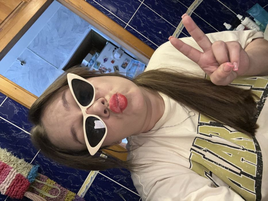 An indoor scene in the city of Chaikovsky, Russia, depicts a female individual taking a selfie. The subject has medium-brown hair pulled back into a ponytail and wears cream-colored cat-eye sunglasses with dark lenses, a light-colored t-shirt with a partially visible graphic, and a thin silver-toned necklace with a circular pendant. Her lips are pursed and covered in red lipstick, forming a "kiss" expression. Her left hand is raised, displaying a peace sign with two fingers, and features pink-tipped fingernails. The immediate background shows a dark blue tiled wall and a light brown wooden door frame. Through the doorway, a light blue wall/ceiling and a white refrigerator adorned with various magnets are visible. To the upper left, a multi-colored striped textile item hangs on the wall. Several white bottles are present on a surface to the right of the subject's arm.