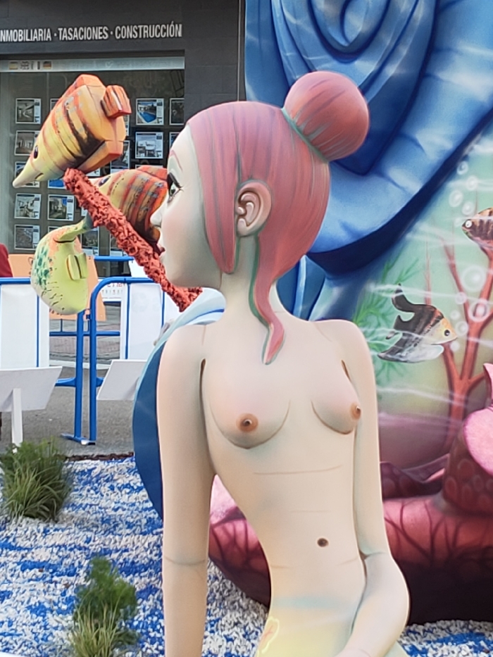 The image displays a large, elaborate outdoor art installation, likely a "falla," situated on a public street in Dénia, Spain. The central element in the foreground is the upper torso of a stylized female figure. This figure has fair skin, pink hair styled in a high bun with a single strand trailing along her neck, and large, wide-set eyes. She is depicted nude from the waist up, featuring visible nipples and a belly button. Her posture suggests she is looking towards her left, with a neutral expression. To the immediate left of the female figure, a textured, coral-like orange branch protrudes, supporting two stylized fish sculptures: one yellow-orange with horizontal stripes pointing left, and another smaller, green fish with spots oriented downwards. Behind these, blue metal crowd barriers are partially visible. In the background, a building storefront is evident, featuring large glass windows displaying real estate listings. The sign above the windows clearly reads "INMOBILIARIA - TASACIONES - CONSTRUCCIÓN" (Real Estate - Valuations - Construction). To the right and behind the female figure, a large, undulating blue structure dominates the background, possibly representing water or a wave. This blue surface is decorated with painted elements depicting an underwater scene, including red and pink coral formations and stylized fish. The base of the entire installation consists of a ground covering of blue and white crushed material or gravel, interspersed with small green plants. The ground beyond the immediate installation area appears to be dark pavement.