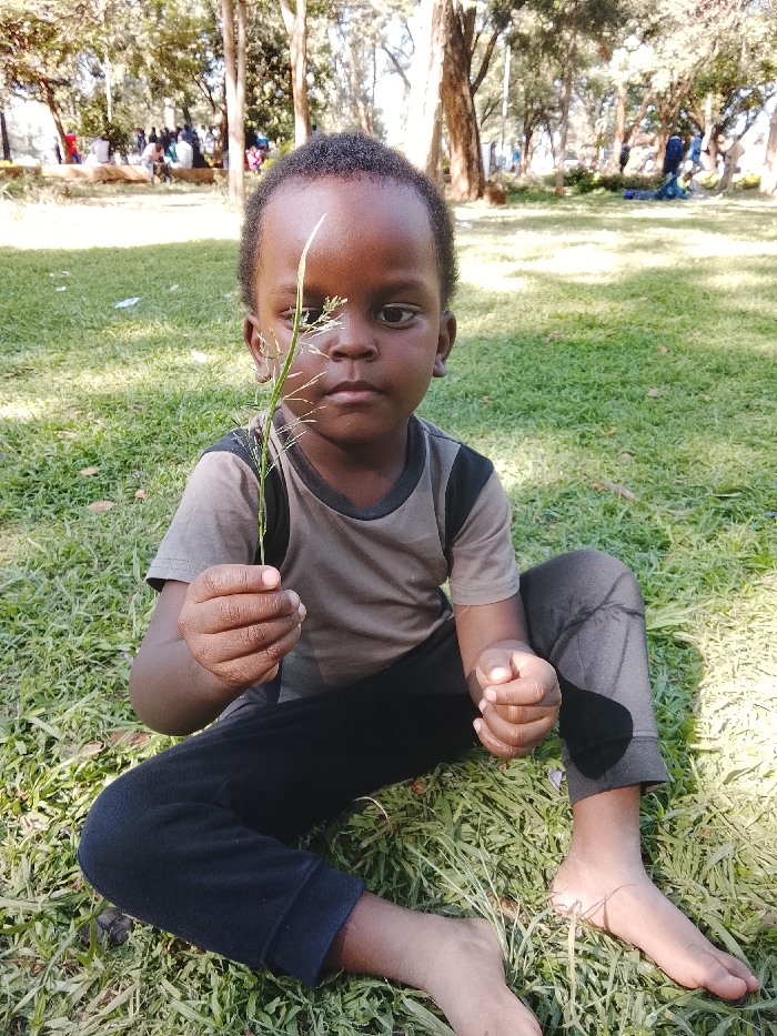 A young child sits on the grass in a park-like setting. The child is barefoot and wearing a gray shirt with black sleeves and black pants. The child holds a blade of grass, staring directly at the camera with a neutral expression. Other people, trees, and park structures are visible in the background, suggesting a sunny day.