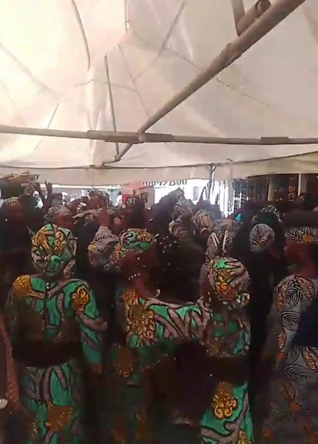 A large group of people, predominantly women, are gathered under a white tent. They are wearing matching outfits featuring green, yellow, and black patterns, along with headwraps in similar or complementary patterns. Many of them are dancing and moving their arms in the air, some holding items on their heads. The tent is supported by metal poles, and glimpses of the surrounding area, including buildings and other people, can be seen through the crowd. The atmosphere appears celebratory and festive.