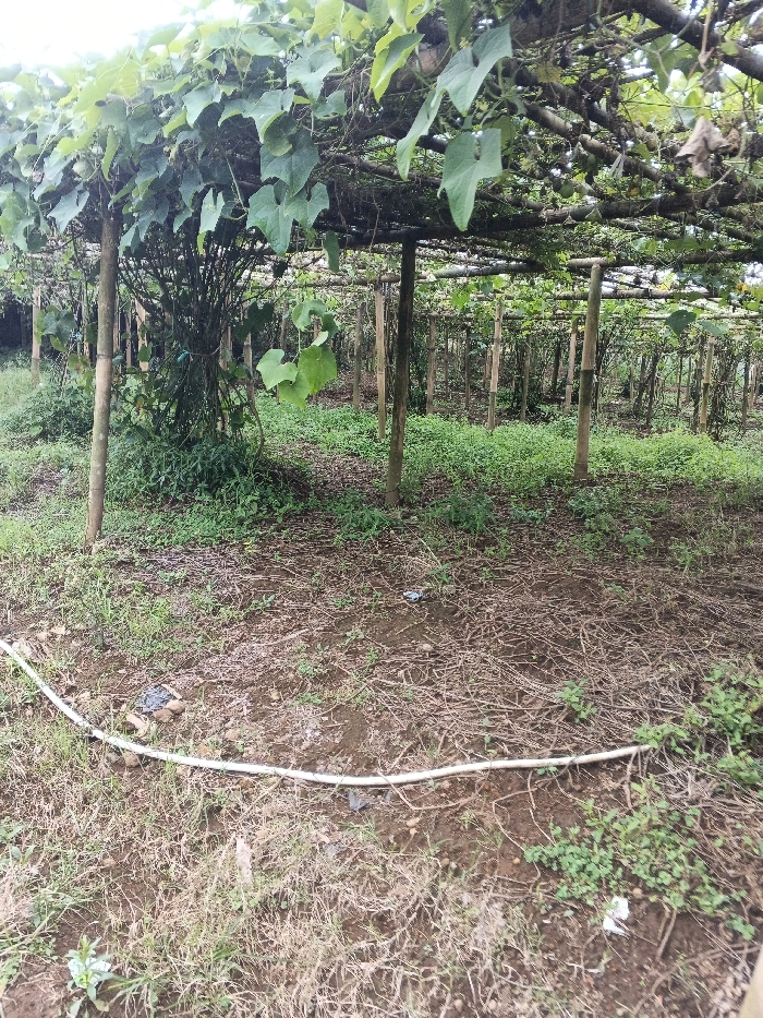 A sprawling gourd tunnel structure dominates the scene, supported by numerous wooden posts. Lush, green vines and broad leaves create a dense canopy. The ground is a mix of bare soil, scattered dried leaves, and patches of weeds. A white hose snakes across the foreground, adding a horizontal element to the otherwise vertical composition. The atmosphere suggests a rural or agricultural setting.
