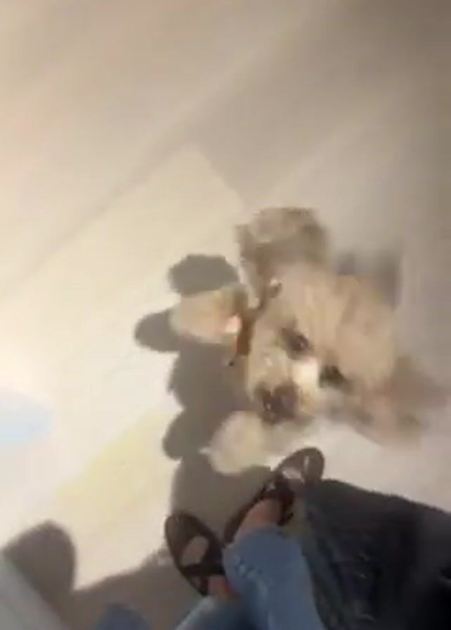 small, light-brown dog, likely a poodle mix, standing on light-colored wooden flooring. The dog is barking aggressively and then runs away from the camera. A person is standing behind the camera, wearing blue jeans, brown sandals, and holding a black quilted purse. The camera angle is a downward-facing shot. The background is minimally visible but shows a plain white wall and a small black object, potentially a light switch or outlet. The sound of barking dominates the audio.