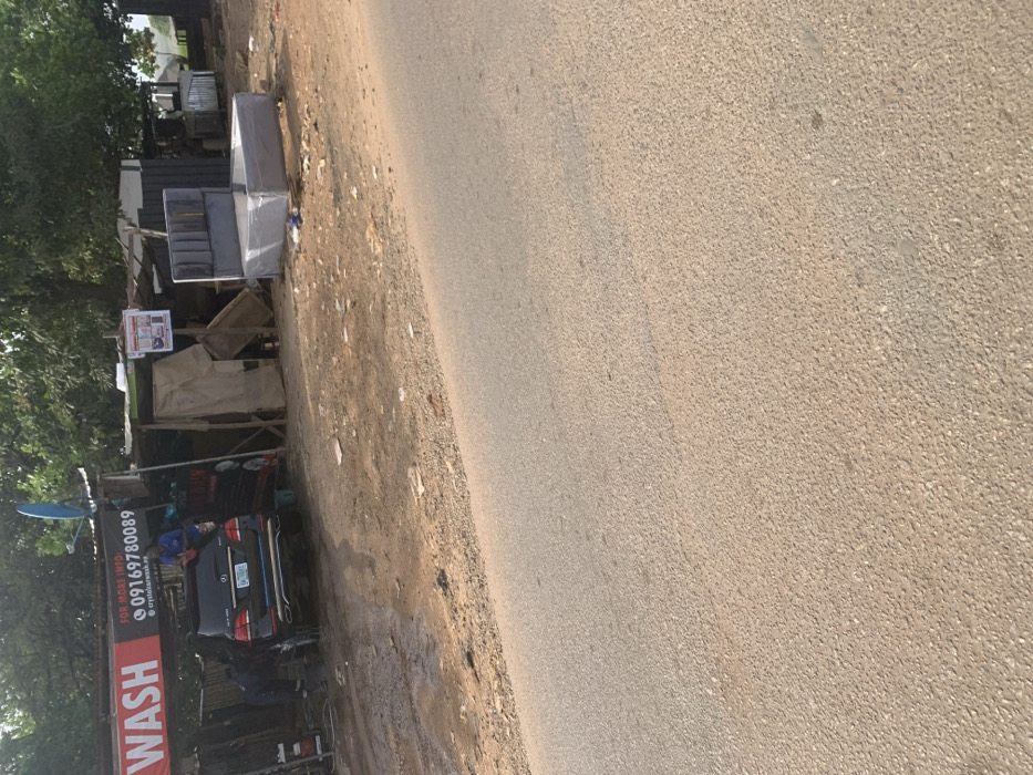 The image depicts a roadside scene in Karsana, Nigeria, featuring a car wash operation and an adjacent outdoor display of merchandise