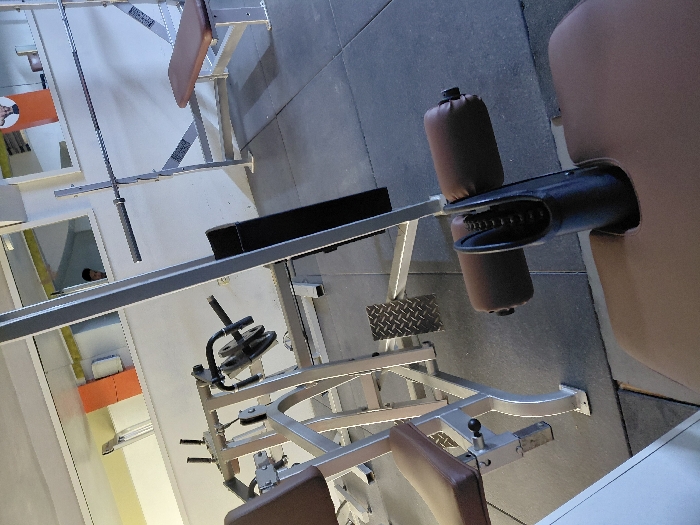 The image depicts the interior of a gym in Mohammedia, Morocco. The floor is covered with dark gray rubber tiles. The walls are predominantly white, with a narrow light-colored horizontal band near the ceiling. In the foreground, the padded seat and leg rest section of a piece of exercise equipment are visible, featuring brown upholstery and black structural components. To the left, a silver-framed weight machine with a brown padded seat is partially visible. Further into the midground, another silver-framed, plate-loaded weight machine with a diamond-plate footrest stands. In the background, a silver-colored free-weight rack with a barbell resting across its J-hooks is present. Adjacent to this, a brown-padded flat bench is positioned. Above the free-weight rack, a square orange poster or sign featuring a shirtless man is affixed to the wall. High on the back wall, reflections in a window or mirror show the head and upper torso of an individual looking into the room. Another orange rectangular panel is visible on the wall in the upper-left reflection. No active exercises or direct interactions are occurring. The scene is illuminated by ambient interior lighting, casting soft shadows.