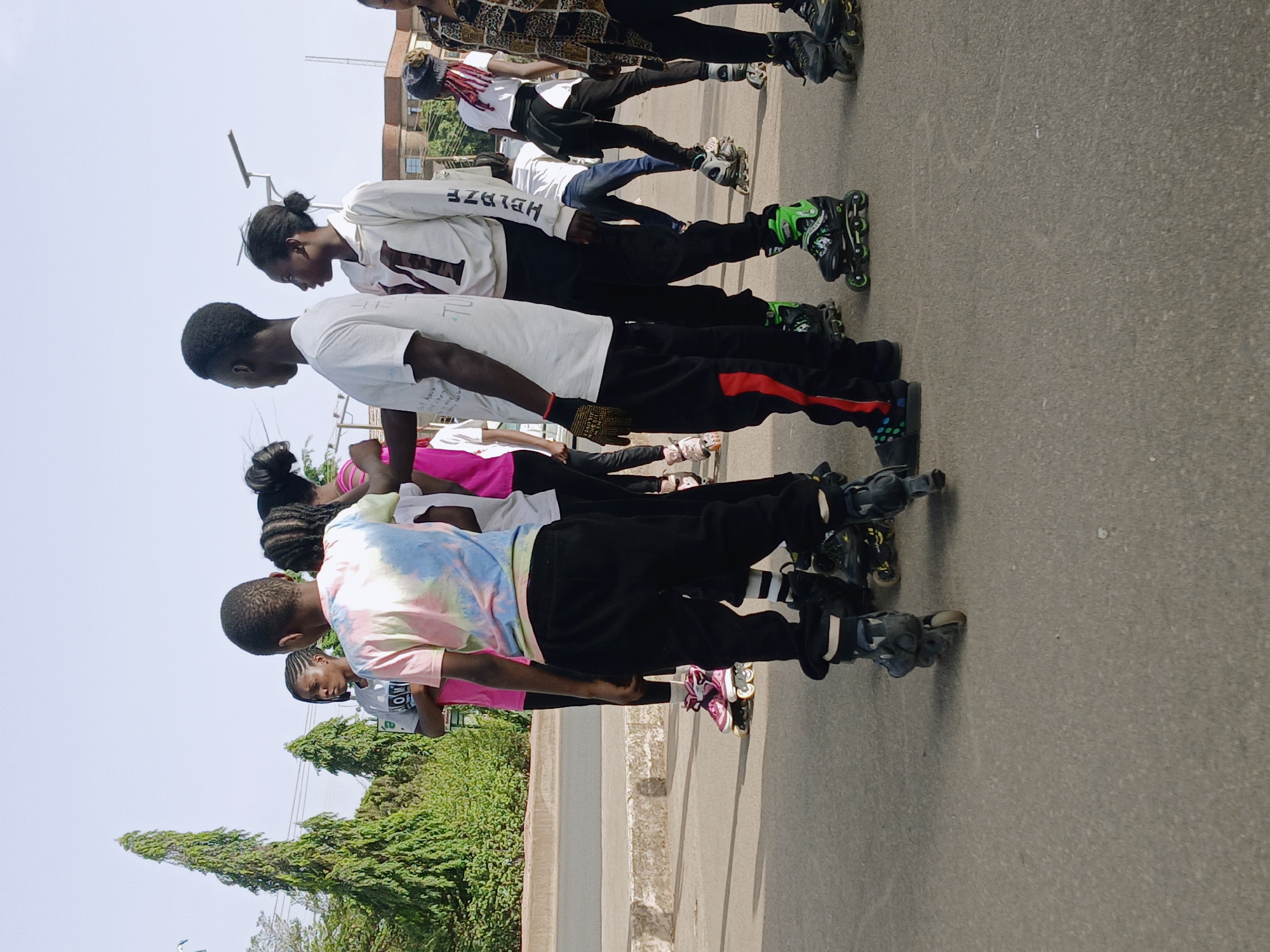 A group of approximately ten individuals, predominantly young adults, stands on a paved surface, possibly a street or open area, under a clear sky in what is identified as Kang, Botswana. The scene captures them engaged in rollerblading activity or preparation. In the foreground and midground, multiple individuals are visible, many wearing inline rollerblades. One person in the foreground, facing away from the viewer, wears a multi-colored tie-dye t-shirt and black trousers with black and blue rollerblades. To their left, another individual wears a white t-shirt and black trousers with a red stripe, also equipped with black and green rollerblades. This person has a yellow and black glove on their right hand and appears to be interacting with another individual to their right. Other individuals are scattered throughout the scene. A person on the left wears a light t-shirt and black trousers, positioned near a green bush line. In the midground, a person wears a white long-sleeved shirt with a large "M" design and black trousers, standing on green rollerblades. Further back, several other people are visible, some wearing pink or black rollerblades, indicating varied equipment. One individual in the background, facing away, wears a white top and blue jeans, also on rollerblades. Another in the far right background wears a patterned brown and black top with black trousers and black rollerblades. The environment includes a paved road surface in the foreground, a raised concrete curb or sidewalk to the left, and a dense line of green foliage, including tall, slender trees and bushes. Utility poles with power lines are visible overhead. In the distant background, several multi-story buildings with reddish-brown facades are discernable under the bright daylight. Streetlights on poles are also visible in the distance. The overall impression is an outdoor recreational gathering.