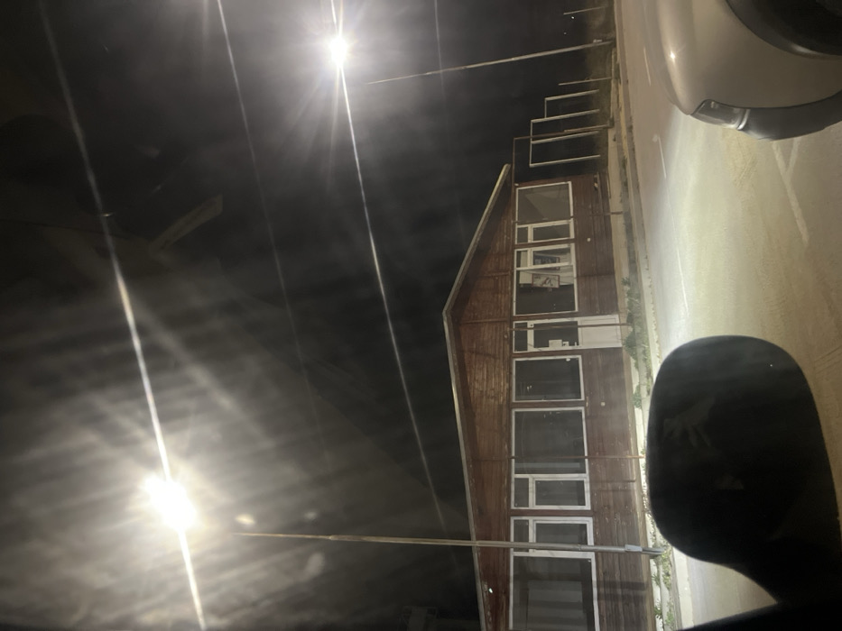 The image depicts a nighttime scene in Byala, Bulgaria. The primary subject is a single-story, horizontal building constructed of reddish-brown wooden planks, featuring a light-colored, possibly white, gabled roofline. The facade is characterized by multiple rectangular windows with white frames, reflecting the dark exterior. A white door is centrally located on the visible front of the building. To the left of the building stands a tall streetlight emitting a bright white light, casting radial flares and reflections across the upper-left quadrant of the image. A second, similar streetlight is positioned on the right side, also radiating bright white light. In the foreground, a paved surface, likely a road or parking area, is visible, illuminated by the streetlights and possibly vehicle headlights. White road markings are discernible on this surface. The photograph appears to be taken from inside a vehicle, as evidenced by a dark, reflective rearview mirror occupying the lower-left corner. The front-right portion of another light-colored vehicle, possibly silver or white, is visible in the lower-right corner, showing part of its front bumper and headlight. To the right of the wooden building, several upright, rectangular frame-like structures are present, along with sparse, dry vegetation on the ground. The background beyond the building and streetlights is uniformly dark, indicating the absence of other significant light sources or structures in the distance. No individuals are visible within the scene.