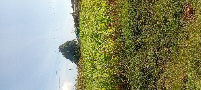 A landscape featuring a verdant field under a clear sky. The field's vegetation transitions from lush green in the middle to a more textured mix of brown and green on the periphery. A solitary tree sits near the field's edge, with power lines crossing the sky. The bright daylight emphasizes the scene's natural elements.