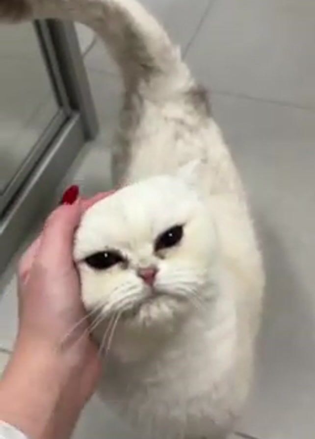 A person pets a white cat in a room with light gray tiled floors. The person has fair skin and wears red nail polish. The cat, named Oscar, appears to be a Persian or similar breed with a flat face and long fur. A partial reflection of the person's legs can be seen in a nearby mirrored surface. The person initially pets the cat on the head, then moves their hand to its body.