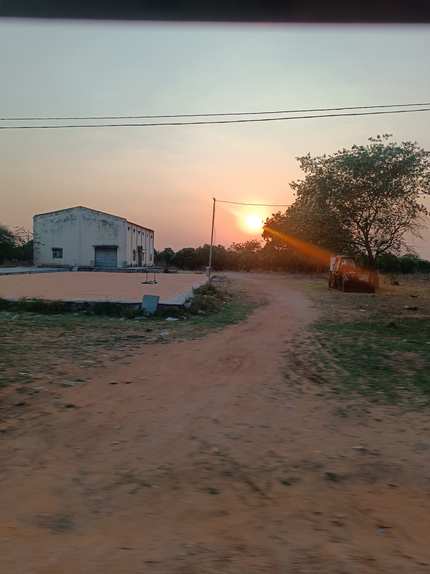 This image depicts an outdoor scene in Kothacheruvu, India, during late afternoon or early evening, indicated by the low sun. On the left midground stands a light-colored, single-story industrial-style building with a closed grey roll-up door and a single window on its left facade. In front of this building, a large, rectangular, elevated concrete or paved area is covered uniformly with light brown granular material, possibly agricultural produce, featuring two metallic structures centrally placed. A winding dirt track occupies the foreground and midground, curving towards the right side of the frame. To the right of this track, a large deciduous tree is present, behind which a yellow and black construction vehicle, consistent with a backhoe, is parked on sparse grassy ground. The sun is positioned low on the horizon, slightly left of the tree, emitting a strong orange glow and a diagonal lens flare. The sky transitions from a pale blue at the top to an orange-pink hue near the horizon, with two parallel overhead power lines visible traversing the upper portion. The surrounding terrain consists of unpaved dirt and sparse vegetation. No people are visible.