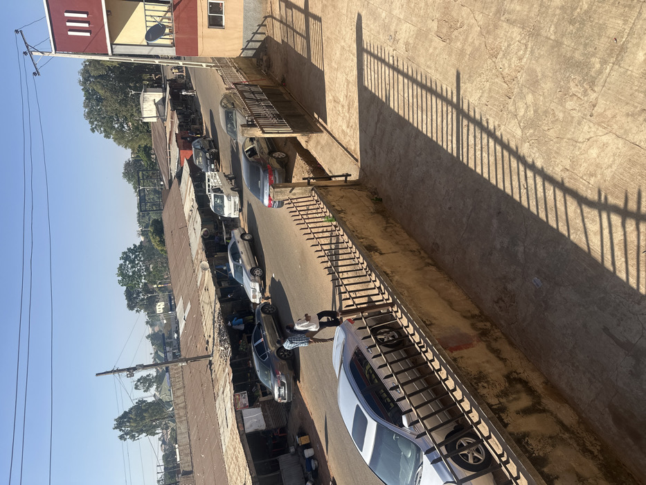 This image captures a street scene in Jos, Nigeria, from an elevated vantage point on a clear, sunny day. In the immediate foreground, a textured concrete surface features long, dark shadows cast by a black metal fence with vertical pickets, running diagonally from the lower right to the mid-left. A silver sedan with a sunroof is parked facing left behind this fence. The main subject is a paved road that extends into the distance, flanked by commercial structures and vehicles. On the left side of the road, a continuous line of market stalls or shops with weathered, reddish-brown corrugated metal roofs and rough-hewn wooden supports stretches along the street. Several individuals are visible near these stalls, though indistinct. Vehicles populate the street: * Immediately beyond the foreground fence, a dark grey sedan (appearing to be a Honda Accord) is parked. * Two men are seen walking on the road beside this dark grey sedan; one in a light-colored shirt and dark pants, the other in a light blue shirt and dark pants. They appear to be walking in the same direction, away from the viewer. * Further down the street, a silver Mercedes-Benz sedan is parked on the left. * On the right side of the street, a white flatbed pickup truck is visible, followed by a dark SUV and another dark sedan (possibly a Honda Civic). More vehicles are present further down the road, diminishing in clarity. A tall utility pole with overhead wires stands on the left side of the street amidst the market stalls. On the right side of the image, a partial view of a multi-story building is present, featuring a red upper facade, a beige lower section, and a black satellite dish mounted on its side. Trees are visible in the background against a clear blue sky, outlining the distant horizon.
