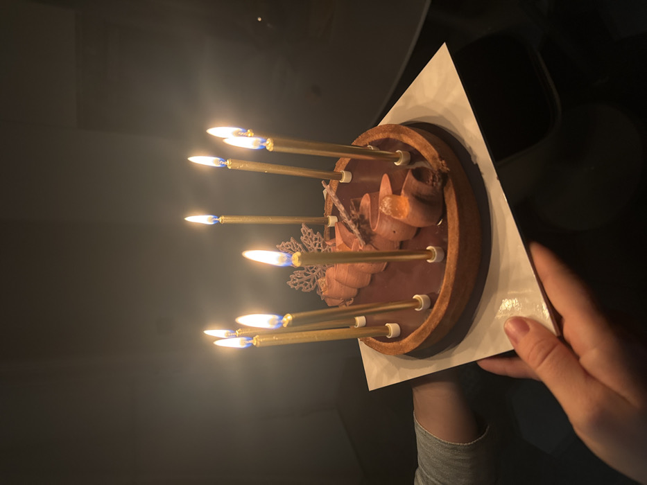 - "A chocolate cake with golden candles is held in someone's hands" by FM-SHEMl1, licensed under CC BY 4.0