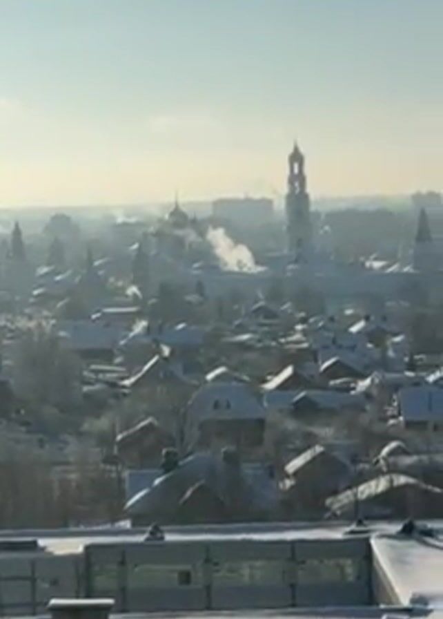 winter cityscape under a bright, pale blue sky. Snow covers the rooftops of numerous buildings and houses. In the distance, there's a large religious complex with a tall bell tower. Smoke billows from a distant industrial area. The camera pans slightly, showing more of the snow-covered town. The roofs of the buildings in the foreground are also blanketed in snow.
