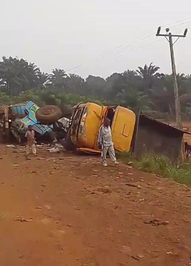 The scene shows the aftermath of a truck accident on a dirt road in what appears to be a rural area, possibly a tropical location based on the surrounding trees