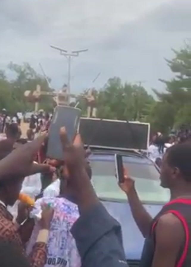 large crowd of people gathered around a blue car. Many people are holding up their phones to record or take pictures. The person in the car appears to be the focus of attention, and some people are reaching out towards him. There is a large wooden structure with figures on top of it in the background. Most people in the crowd are wearing white shirts with writing on them, possibly signatures or messages. The environment appears to be outdoors with trees and a cloudy sky. There is music playing.