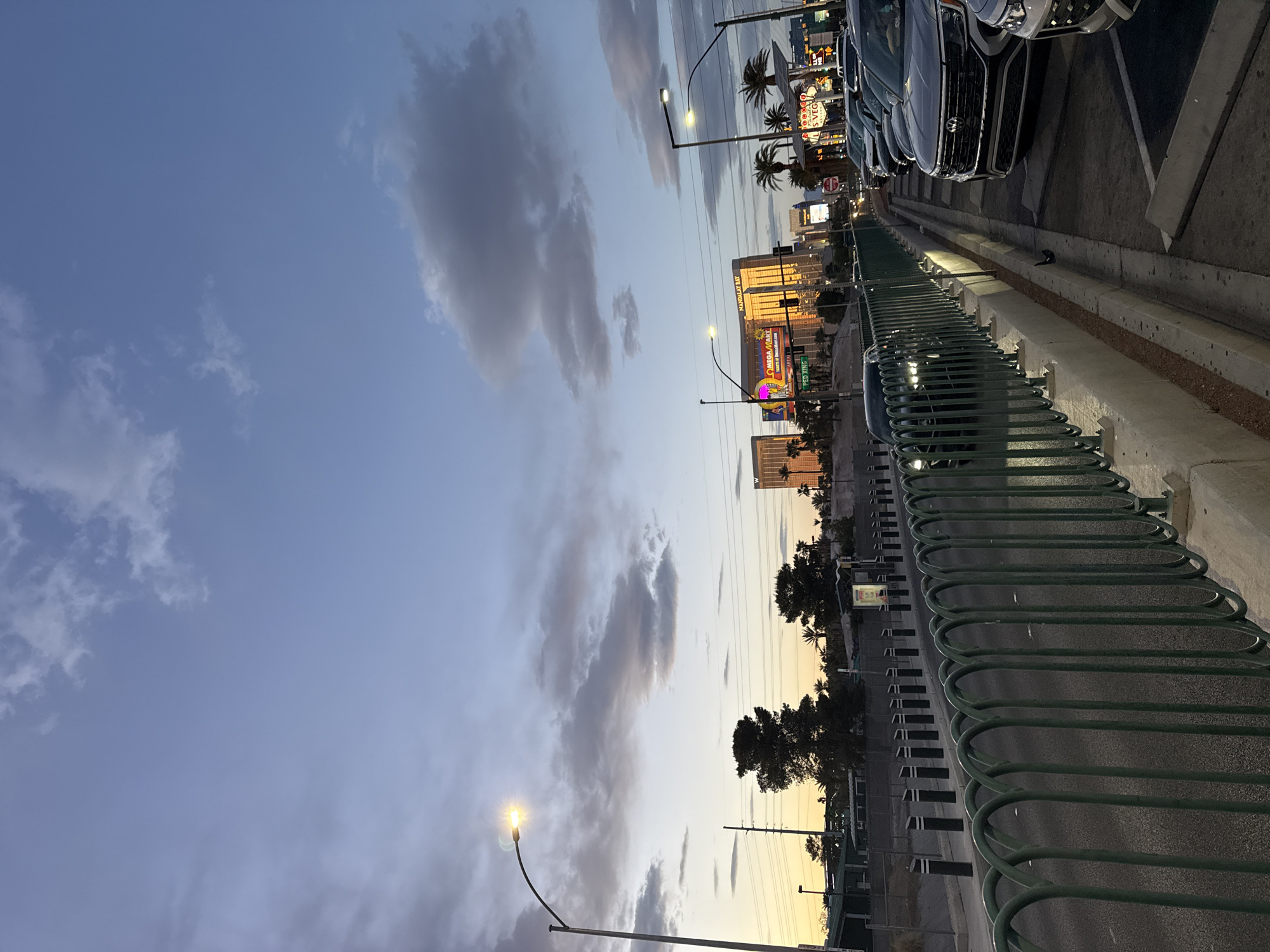 This photograph shows a street scene in Paradise, Nevada, United States of America, likely a view of the Las Vegas Strip at dusk. The composition is dominated by a perspective along a guardrail or fence running parallel to a line of parked cars on the right side. Beyond the guardrail, the photograph captures the illuminated casinos and buildings of the Las Vegas Strip, under a sky streaked with clouds illuminated by the setting sun. Palm trees are visible, contributing to the desert landscape. Streetlights punctuate the scene. The focus of the image appears to be on the urban landscape and the blend of natural and artificial light.