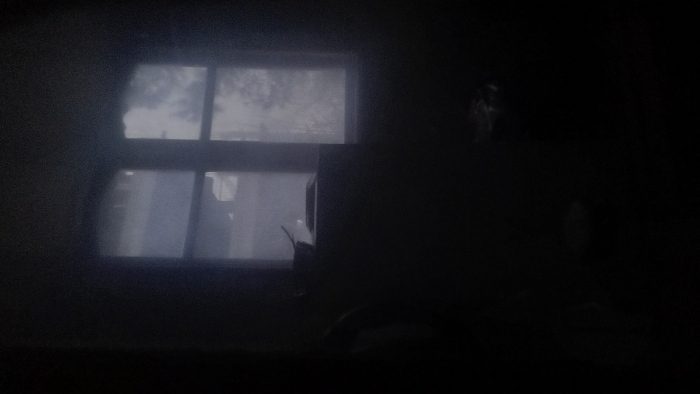 A dark, possibly interior, scene reveals a window with two panes reflecting an exterior view