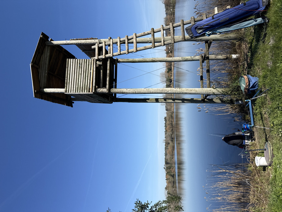 The image depicts a daytime scene at a lake in Mira, Portugal, under a clear, bright blue sky featuring faint contrails. A weathered wooden observation tower, constructed from debarked logs with a covered top section and an attached ladder, stands prominently on the right. Its lower structural supports are reinforced with diagonal metal bracing. To the left of the tower's base, a single individual, wearing a dark jacket, is seated on a low chair, facing the calm, dark blue water. Two fishing rods are actively deployed in a blue metal rod holder in front of the person. Additional fishing equipment includes a white bucket with a handle and a blue and green soft cooler bag on the grassy ground near the seated individual. A larger blue fishing rod case or gear bag leans against the base of the tower's ladder. The lake water, reflecting a distant treeline of mixed deciduous and evergreen trees, occupies the midground. Tall, dry reeds line the immediate shore in the foreground. Strong sunlight casts distinct shadows.