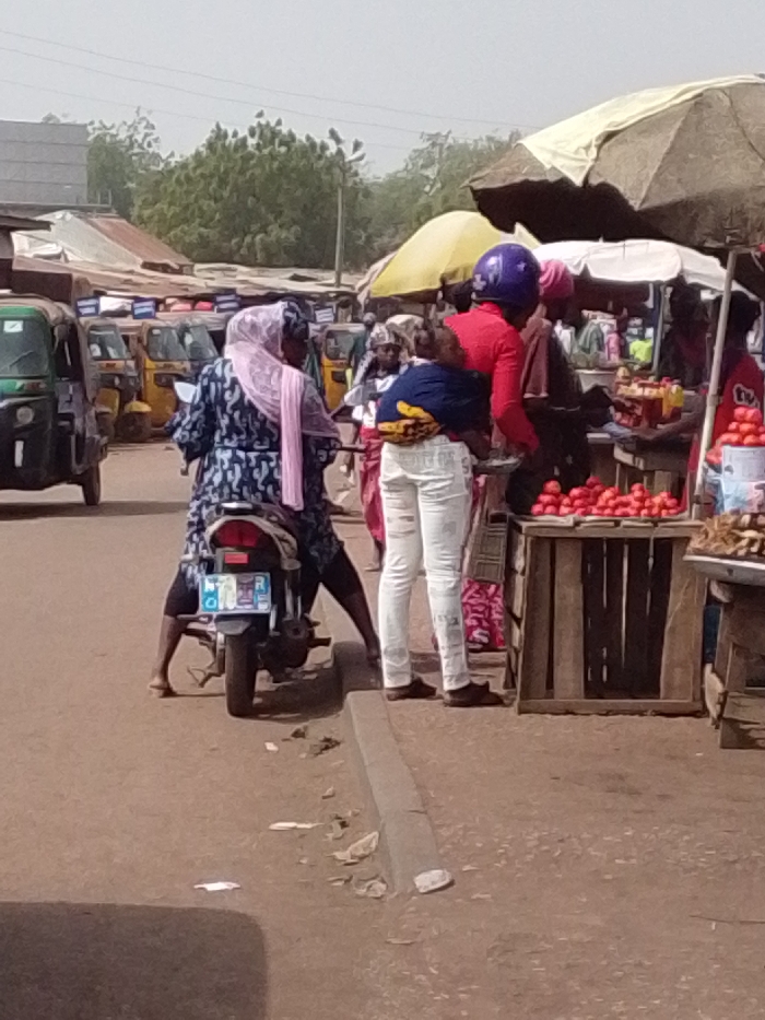 The image depicts a bustling street market scene in Tamale, Ghana, under bright daylight