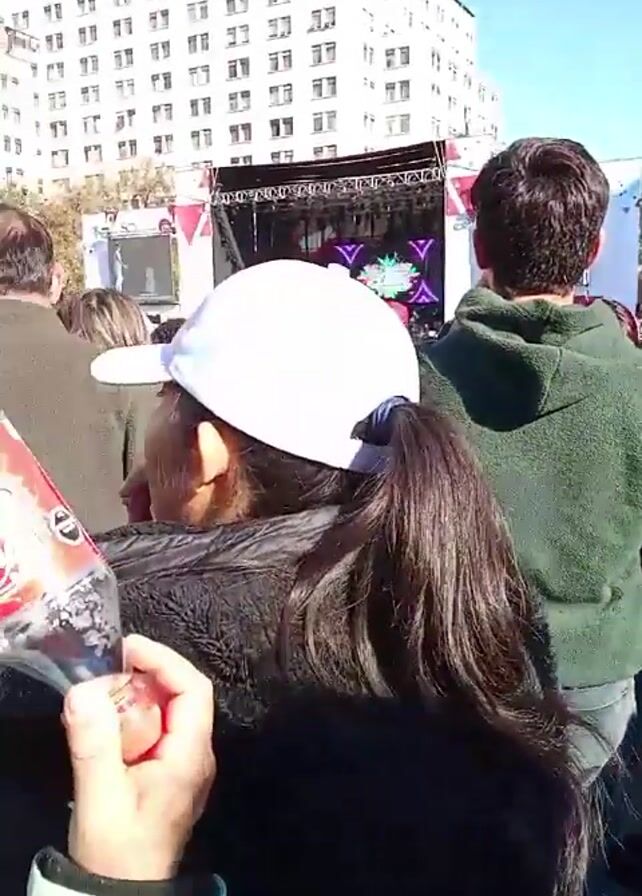 crowd of people gathered in front of a stage, with tall buildings in the background. The crowd appears to be enjoying a performance, as music is playing. People are wearing casual clothing and some are holding drinks. Several individuals can be seen taking pictures or videos with their phones. The atmosphere appears lively and festive. A black dog with a harness is visible amidst the crowd. A few flags are seen waving behind the stage. The sky is clear and blue with some light clouds.