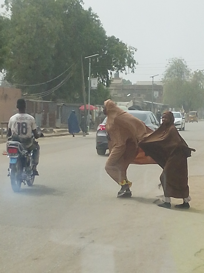 The scene depicts a street in Hotoro North, Nigeria, under hazy daylight conditions