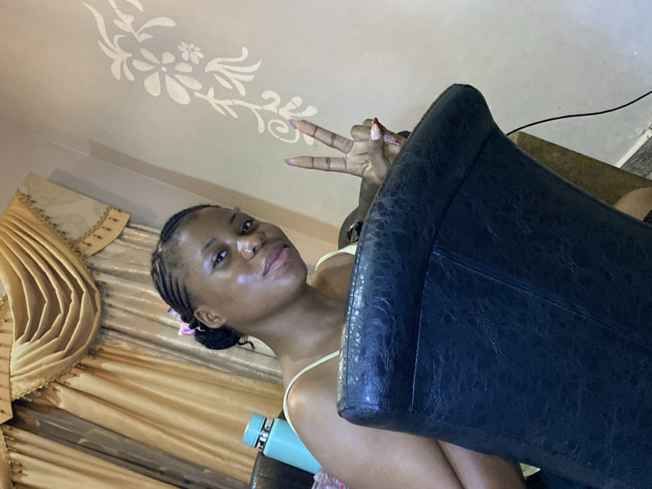 A woman with braided hair poses, giving a peace sign. She wears a light-colored top. A dark blue leather chair is in the foreground, partially obscuring her. A blue water bottle rests nearby. Ornate beige curtains are visible in the background, alongside a wall with white floral stencils. A black power cord runs along the top of the wall.
