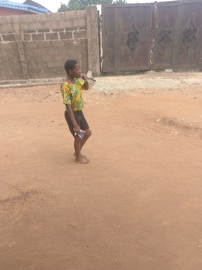 A young person stands barefoot on reddish-brown dirt ground in Agege, Nigeria. The individual wears a short-sleeved shirt with a yellow background and green leaf pattern, paired with black shorts. Their right hand is raised towards their mouth, and they hold a transparent plastic sachet in their left hand. Behind the individual, to the left, is a low wall constructed from unpainted concrete blocks, with a blue-roofed structure visible above it. To the right, a large, dark, double metal gate featuring ornate scrollwork patterns is visible, situated on a concrete base. Distant foliage is present above the gate.