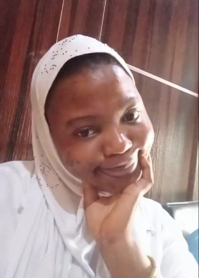 The video features a woman in a white headscarf and top, leaning her face against her hand. She is inside what appears to be a home. The background consists of a wooden door. The woman looks directly into the camera. The lighting is somewhat dim and uneven. There is indistinct audio of conversation in the background.