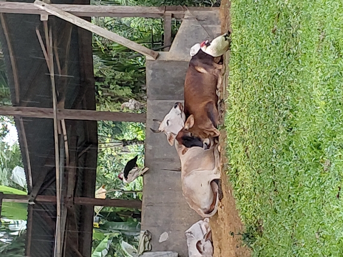 A rustic structure stands beside lush greenery. Within the structure's frame, several birds perch on wooden beams. Outside, two cows, one light brown and the other darker, rest near the base of the structure. Another, smaller cow lies further below. The scene conveys a rural, possibly agricultural setting.