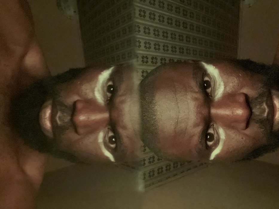 The image displays a vertically arranged double portrait of a single dark-skinned male subject. The upper image shows the subject inverted, while the lower image shows the subject upright. Both depictions feature the male with a short beard and mustache, along with distinct white or light-colored paint applied in an arc beneath each eye. His expression in both instances is characterized by furrowed brows and direct eye contact. Portions of his bare chest or shoulders are visible at the top and bottom of the frame. The background on the left is dark and indistinct, while the right side features a patterned surface, possibly wallpaper, composed of vertical stripes with repeating four-petal or geometric motifs. The setting appears to be indoors; however, no visual markers or identifiable features are present to confirm its location within the city of Gura Top, Nigeria.