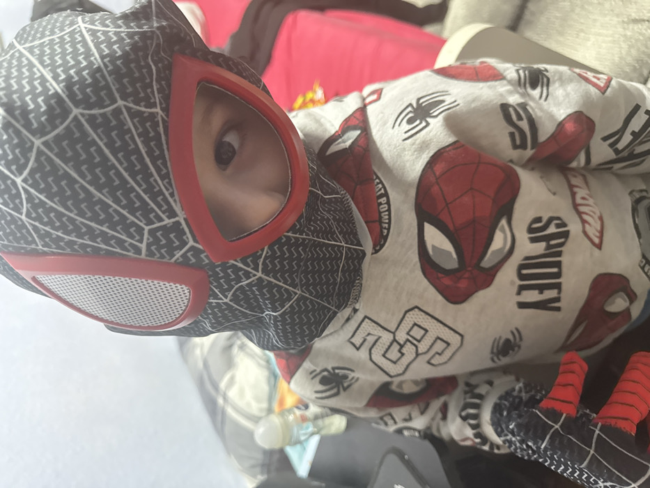 A young child, appearing to be a toddler or preschooler, is depicted indoors in Memmingen, Germany. The child is wearing a black and grey patterned Spider-Man mask featuring red outlines around white mesh eye lenses. A light grey hoodie with various red and white Spider-Man faces, black spider symbols, and "SPIDEY" text is worn. A black glove with red finger segments, part of the costume, is visible on the child's left hand. The child's left eye is visible through the mask's opening, directed towards the viewer. In the background, a baby bottle containing a white liquid is visible on a surface to the left, and a portion of red fabric is seen on the right.