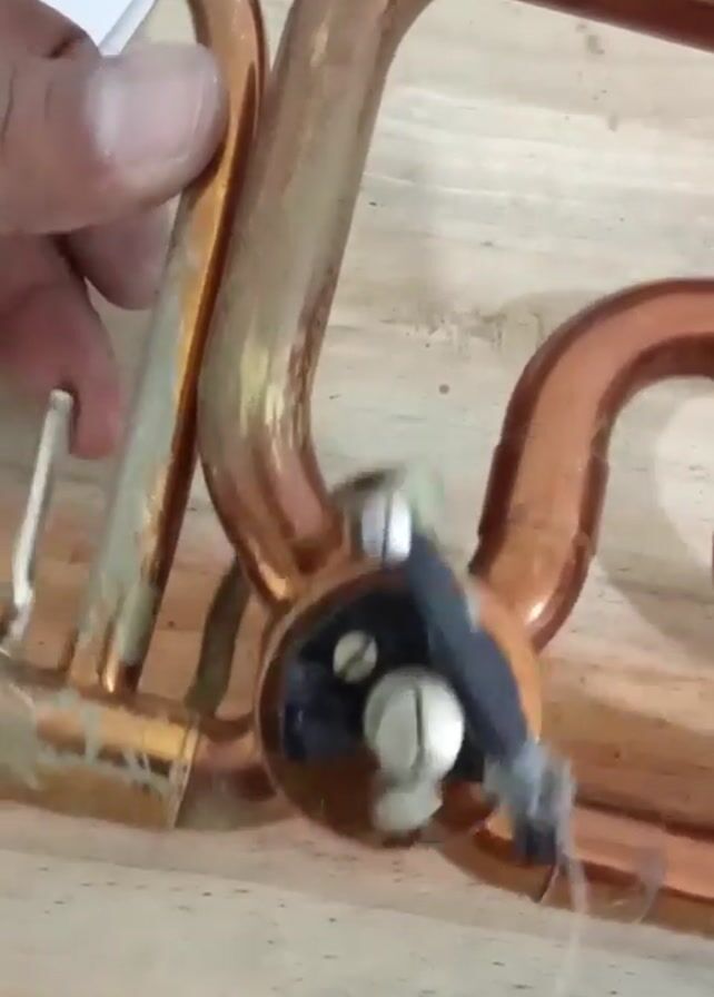 person's hand moving a silver metal piece connected to a copper-colored metal instrument. The instrument has several curved tubes and a black circular component with screws. The instrument appears to be old and shows signs of wear and corrosion. The background is a light-colored wooden surface.