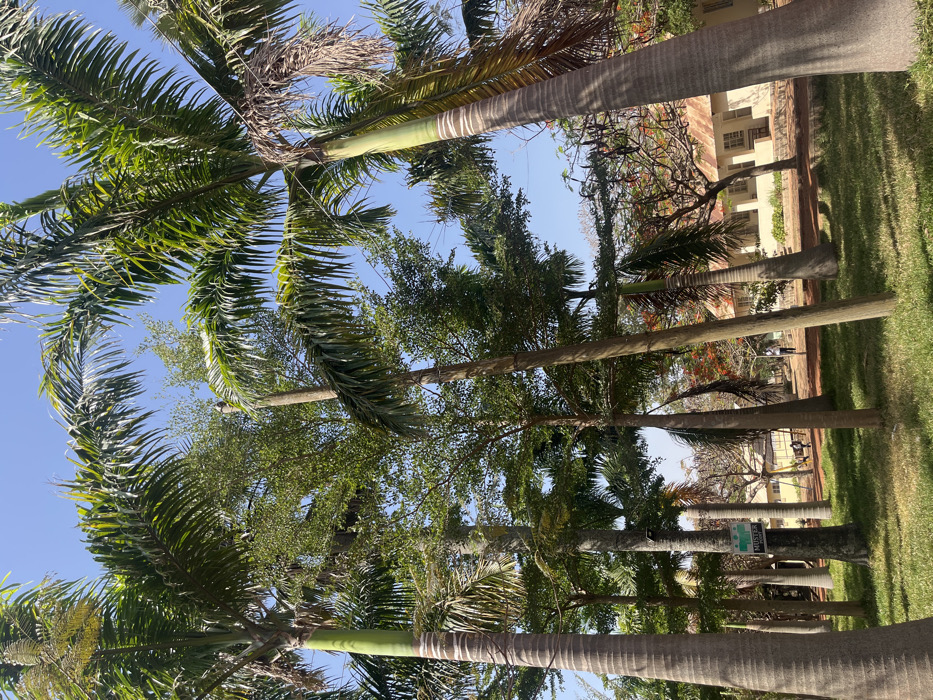 This image depicts a sunny outdoor scene in Miango, Nigeria, characterized by abundant tropical vegetation under a clear blue sky. The foreground and mid-ground are dominated by numerous tall palm trees with green fronds and light-colored, ringed trunks, some appearing green near the crown. Other deciduous trees with dense green foliage are interspersed among the palms, and some trees exhibit reddish blossoms or seed pods. The ground is covered in well-maintained green grass. In the mid-ground, a white and green sign displaying "MUSTER POINT" with a graphic of two figures is affixed to the trunk of a tree. Towards the right side of the mid-ground, a single individual wearing a white shirt and dark pants is visible walking on a dirt path. Further back on the left, two smaller, indistinct figures are present near a low-lying structure or equipment. In the background, several single-story buildings with light-colored walls and reddish-brown corrugated metal roofs are visible, featuring multiple windows. The overall environment suggests a well-tended park, campus, or institutional setting.