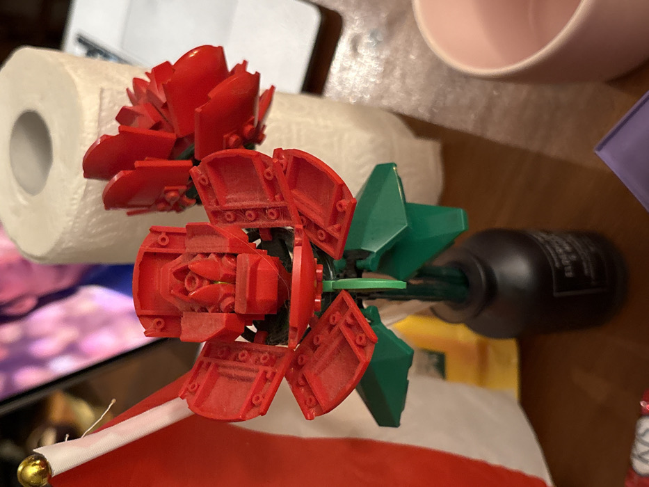 An indoor domestic setting, likely an apartment or residence, in Paris, France. The central focus is a bouquet of two red Lego-brick flowers, each with green stems and leaves, standing in a dark, matte black cylindrical container. The forward-most flower is partially open, revealing its red and yellow internal Lego components, and exhibits a fine layer of dust. The second flower, positioned behind and to the right, appears more closed. The container rests on a polished, medium-brown wooden surface. To the immediate left of the container, a vertical red and white striped fabric, topped with a small golden spherical finial, is visible. In the background, a white roll of toilet paper stands upright, slightly out of focus. Behind the toilet paper and the flowers, a bright, blurred digital screen displays colorful, indistinct imagery, possibly a person. To the right, a light pink ceramic mug is partially visible. In the bottom-left corner, a red and white candy wrapper with partial lettering "KISS" is visible. A blurred purple object is present in the bottom-right corner. No individuals or direct interactions are visible.