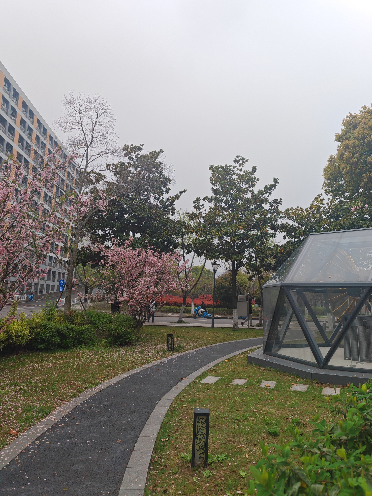 The image depicts an outdoor scene in Jiangning District, China. A path curves through a grassy area dotted with fallen pink blossoms. Adjacent to the path is a modern geometric glass structure. In the background, blooming cherry blossom trees stand near a tall building with numerous windows and balconies. A street runs parallel to the building, with people walking and riding scooters. The sky is overcast, suggesting a cloudy or foggy day. Streetlights are visible along the road, and various trees and bushes are present in the landscape.