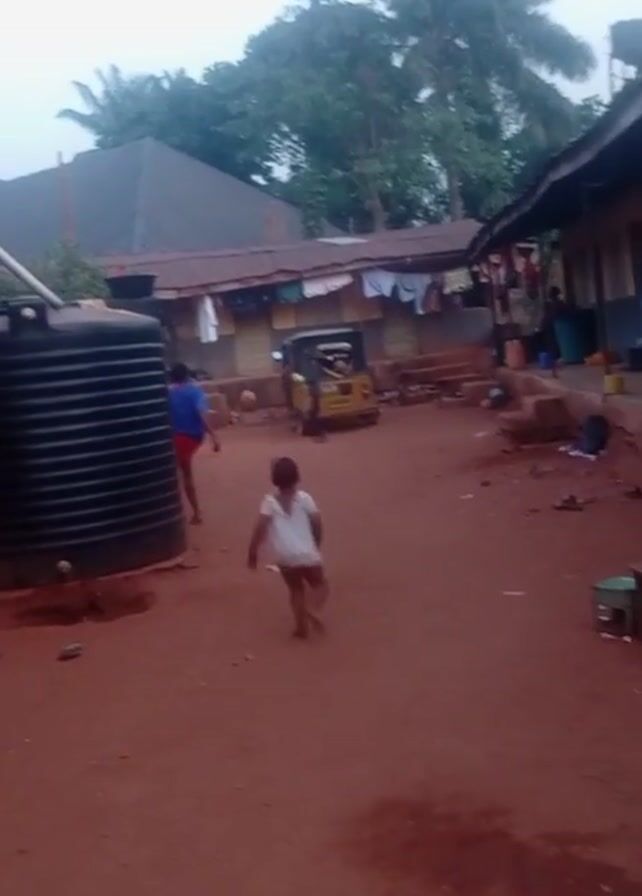 red dirt courtyard surrounded by buildings in what appears to be a rural area. In the courtyard, there is a large black water tank on the left. A young boy in a blue shirt and red shorts walks across the courtyard from left to right. A small girl wearing a white shirt walks in the same direction, ahead of the boy. In the background, there's a yellow three-wheeled vehicle. Clothes hang on a line strung between buildings in the background. There are benches and other objects scattered around the courtyard. Trees are visible in the background.