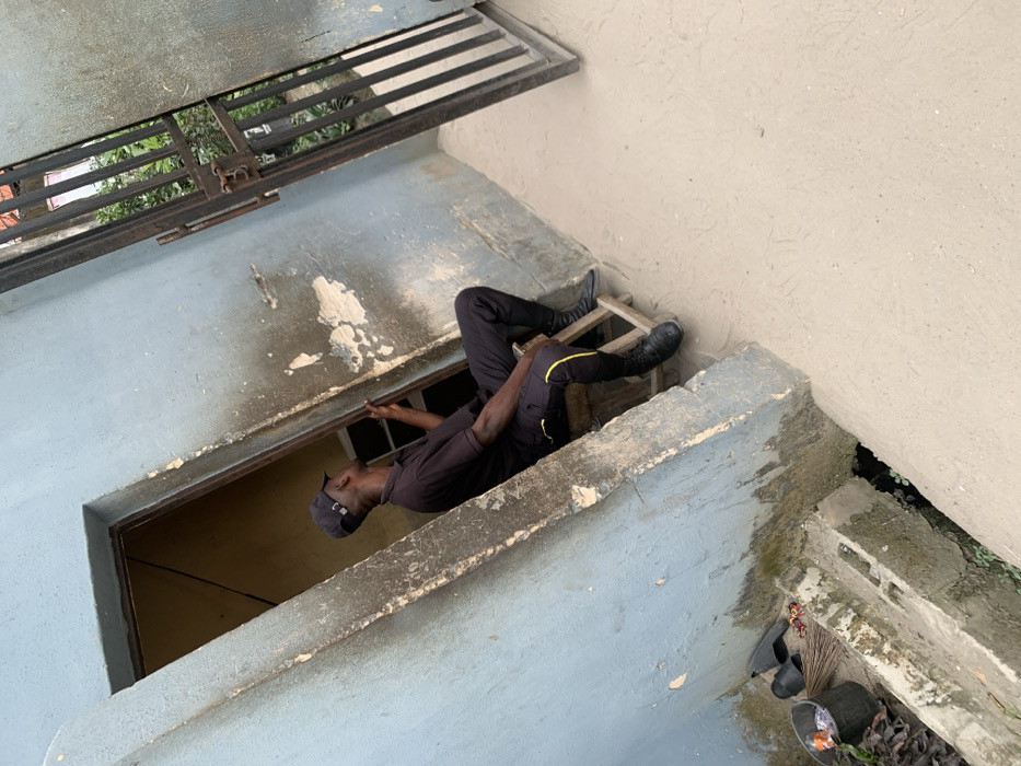 The scene, located in Sangotedo, Nigeria, depicts an outdoor area featuring a light blue, weathered concrete building and a sandy ground surface. An adult male is seated on a low, wooden stool positioned within an open doorway of the building. He is dressed in a black baseball cap, a black short-sleeved polo shirt, black cargo trousers with a single yellow stripe on the outer seam of the left leg, and black boots. The man's body is angled slightly to the right, and his head is tilted upwards, directing his gaze towards the upper frame of the doorway or beyond. To the right of the doorway, a dark, vertically barred metal gate with a visible latch mechanism stands open, revealing green foliage in the background. The ground directly outside the building is covered in light-colored sand. In the lower-left foreground, a concrete drainage channel containing dark water and some vegetation is visible. Adjacent to the channel are a black plastic bucket containing debris, a single black flip-flop, and a broom. The building's exterior shows signs of wear, including peeling paint and dark stains, particularly around the base and doorway.