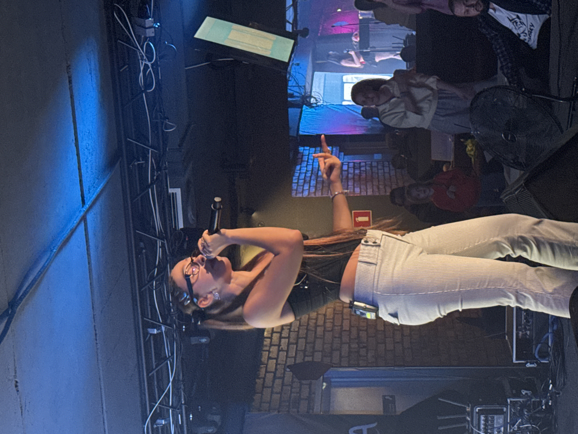 A female vocalist is performing live on stage at an indoor music venue in Volgograd, Russia. She stands prominently center-left, illuminated by blue and pink stage lighting. The performer has long, dark hair styled in a ponytail, wears eyeglasses, a black sleeveless top, and light-colored vertically striped flared pants. A small, rectangular silver-colored device is clipped to the left side of her waistband. She holds a black microphone to her mouth with her right hand and extends her left hand forward with fingers slightly spread. Her head is tilted upward. The stage floor in the foreground features black stage monitor speakers and a large black electric fan positioned to the right of the performer. To the left, multiple cases of audio equipment are stacked vertically. The background includes a section of exposed brick wall on the left. In the mid-ground audience area, several individuals are visible, including a young girl in a red hooded sweatshirt seated on the left and a bearded man in a plaid shirt over a white t-shirt seated on the lower right. Further back on a raised platform, another woman in a light-colored outfit appears to be engaged with stage equipment, possibly a keyboard. The ceiling structure is visible above, featuring exposed conduits, wiring, and support beams, all highlighted by blue ambient lighting. A vertical, light blue rectangular banner or screen hangs from the ceiling on the upper right side. A red "1" on a white square background, possibly an exit indicator or fire equipment sign, is affixed to a wall section on the mid-right.