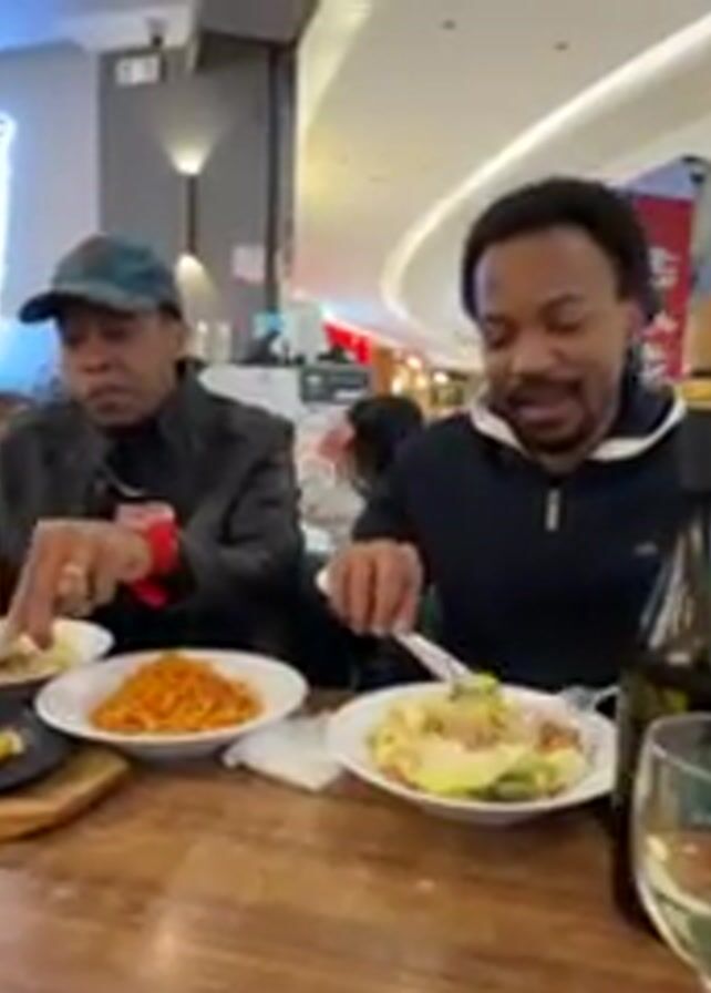 Two men are seated at a table in a restaurant, each eating with a fork and knife. On the table, there are plates of food including spaghetti, salad, sausage and a white wine bottle with two glasses of white wine. One of the men wears a baseball cap and a red wristband. The other man has a mustache and wears a navy blue pullover. Other restaurant patrons are visible in the background. A neon sign depicting Italian landmarks decorates a nearby wall. The restaurant appears to be within a shopping mall or large commercial space.
