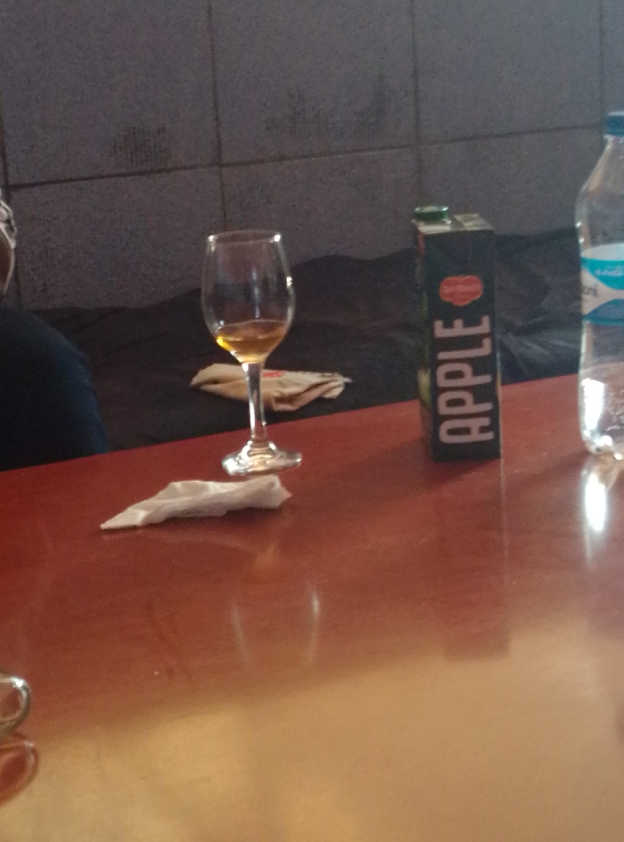 The image portrays an indoor setting within a commercial establishment in Webuye, Kenya. A polished, reddish-brown table occupies the foreground. On the table, from left to right, are a crumpled white paper napkin, a stemmed glass containing a small amount of amber liquid, a black rectangular carton labeled "APPLE" vertically with a red apple logo, and a clear plastic water bottle with a blue and white label, partially filled with water. Directly behind the wine glass, on a dark, possibly upholstered surface, another crumpled paper napkin is visible. The background consists of a grey tiled wall featuring visible grout lines and minor surface discoloration. A portion of a person's left shoulder and upper arm, clad in a dark garment, is visible on the far left, with a small section of a white accessory or head covering also present at the upper left edge of the frame.
