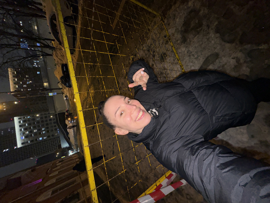 A woman in a black puffer jacket lies on the ground next to a yellow-and-gray metal fence, smiling and flashing a peace sign. The background shows an urban scene at night with tall buildings lit up. A snow covered ground can be seen next to the fence. Red and white striped barrier is at the bottom of the fence. The photo is taken at a tilted angle.