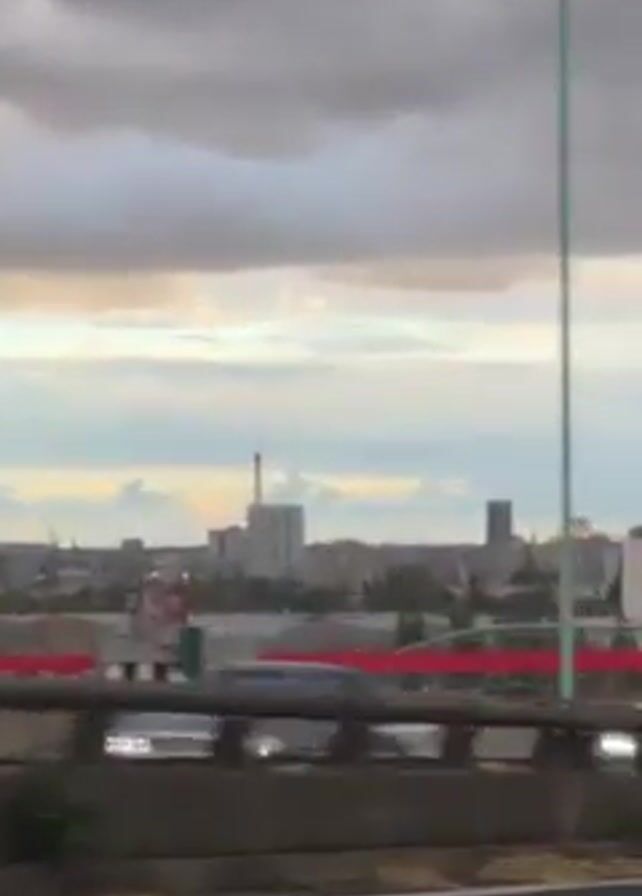 traffic on a highway, with a city skyline visible in the background beneath a cloudy sky. The camera is positioned to the side of the highway, likely within a vehicle, capturing the movement of cars and trucks. Some tall buildings and a tower can be seen in the distance, blending with the grey and white sky. The highway has a concrete barrier with a red stripe on the other side, and light poles are visible along the side of the road.