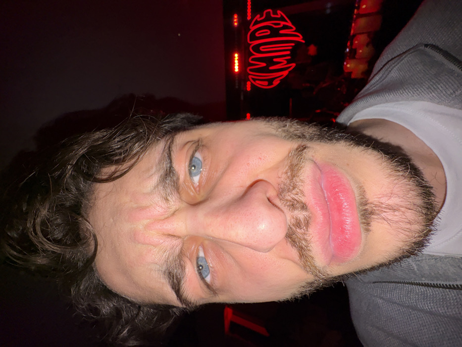 A selfie shows a man with blue eyes and a stubbly beard, making a scrunched-up face. His lips are noticeably full and pink. He's wearing a gray jacket over a white shirt. In the dim background, red neon letters spelling "AMORE" are visible. The lighting is focused on his face, highlighting his features. The image is tilted at an angle.